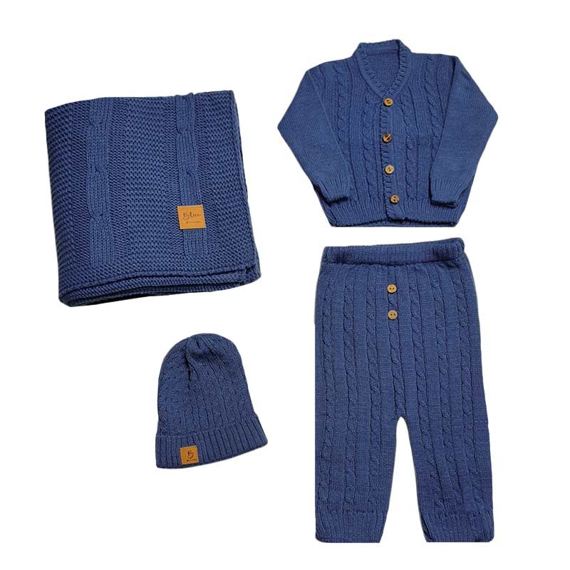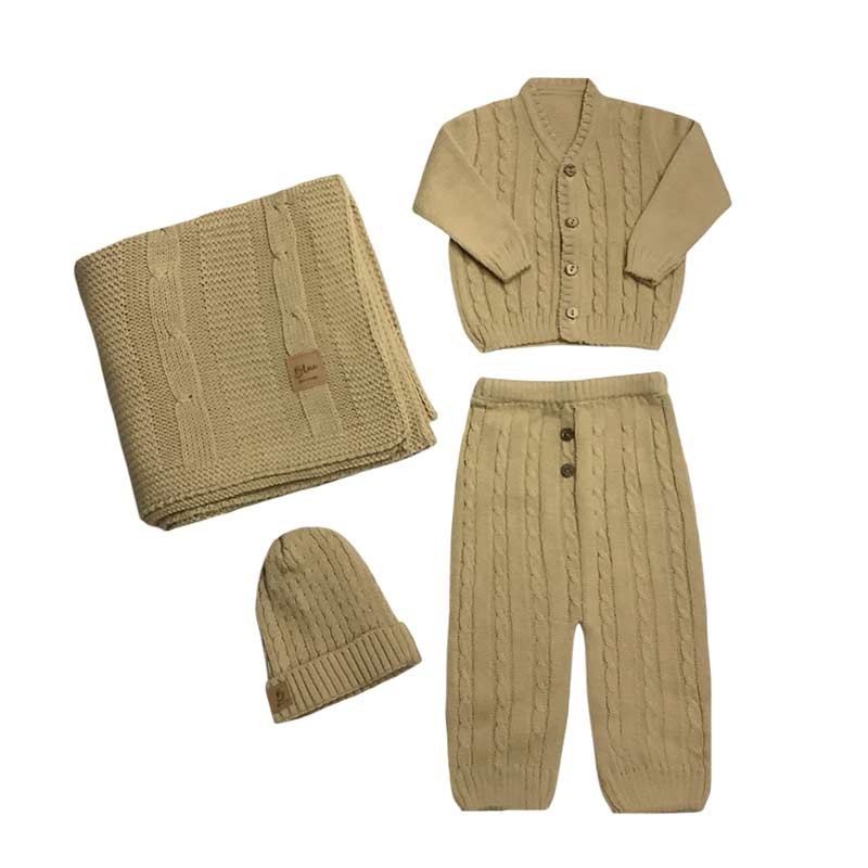Ajuar x 4 piezas tejido. Incluye: manta, saquito c/botones, pantalón c/botones y gorrito.