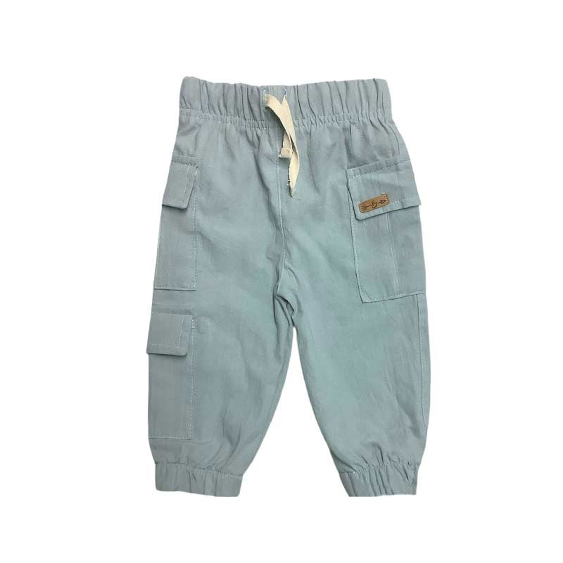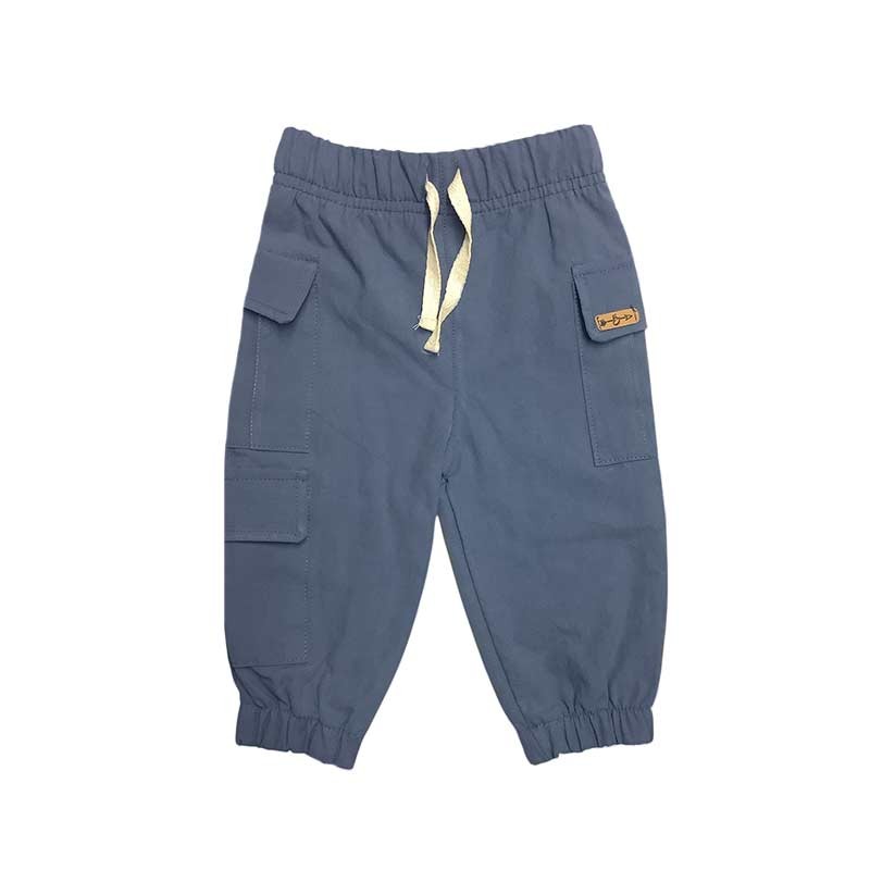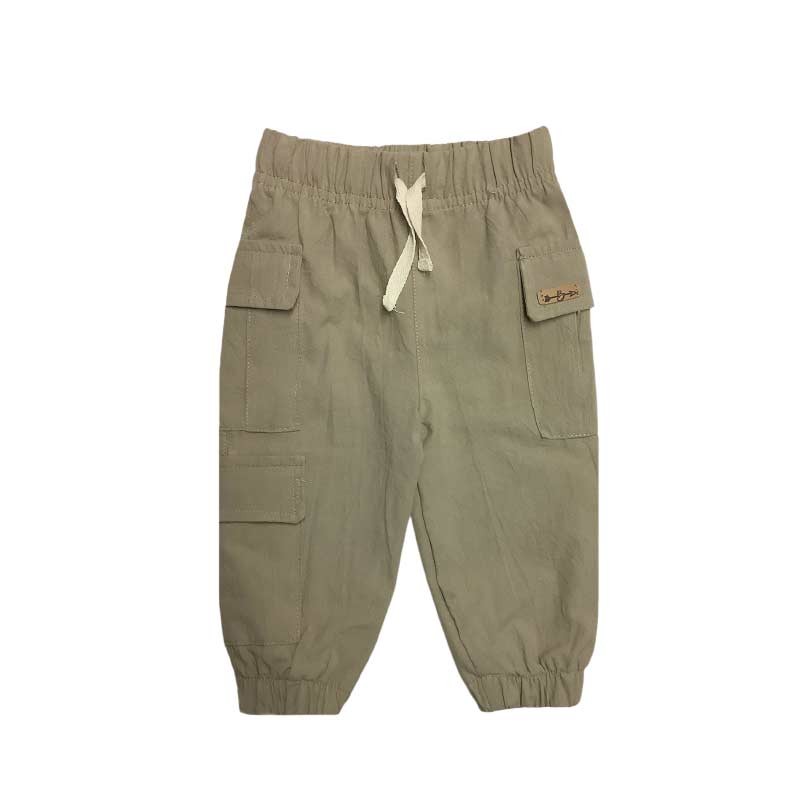 Pantalón bebé tussor liso, con bolsillos cargo, puños elásticos, y cordón en cintura.