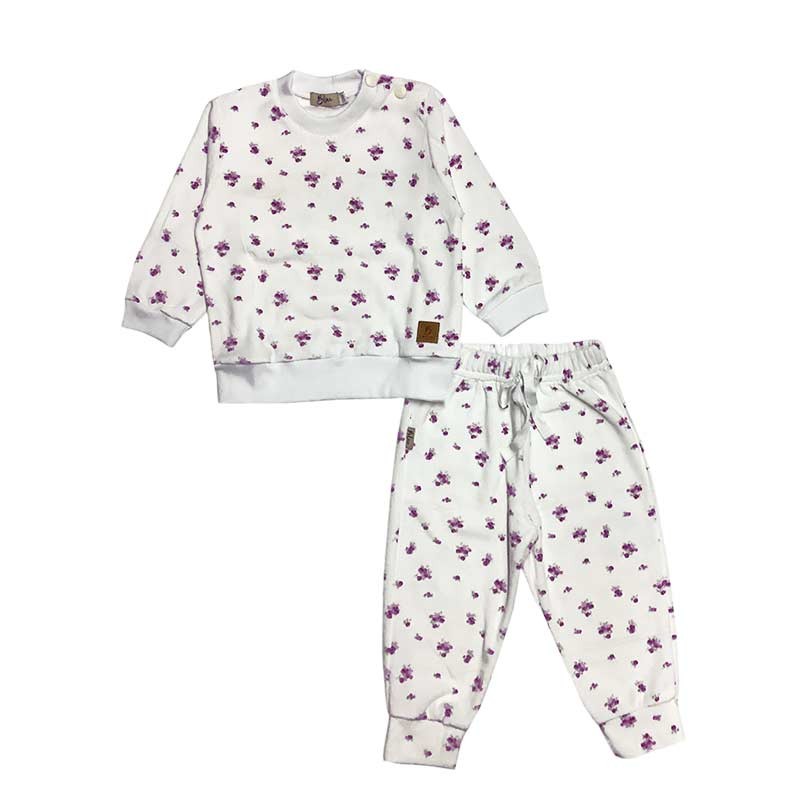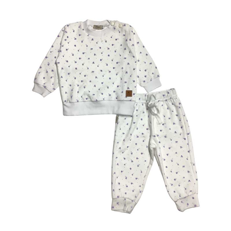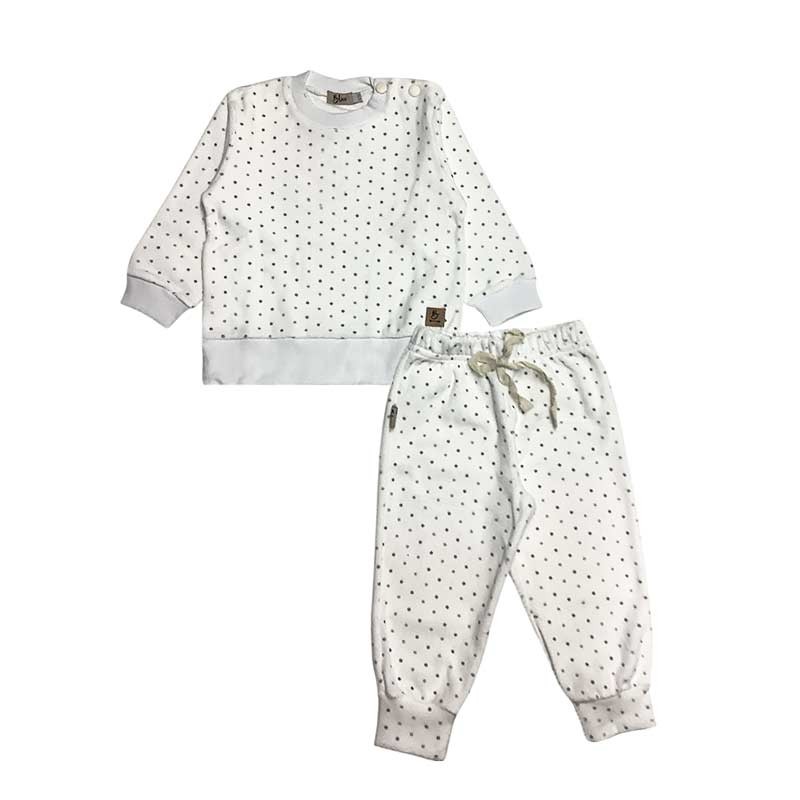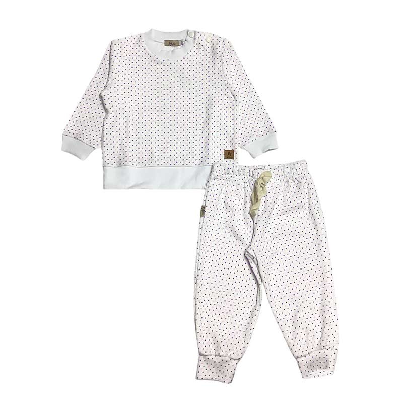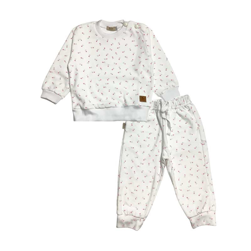 Conjunto beba 2 piezas flores / lunares plush: buzo con broches + pantalón c/puño con cintura y detalle puntilla.
