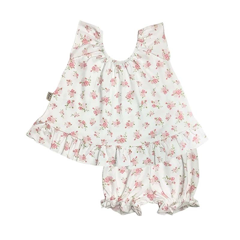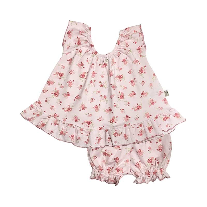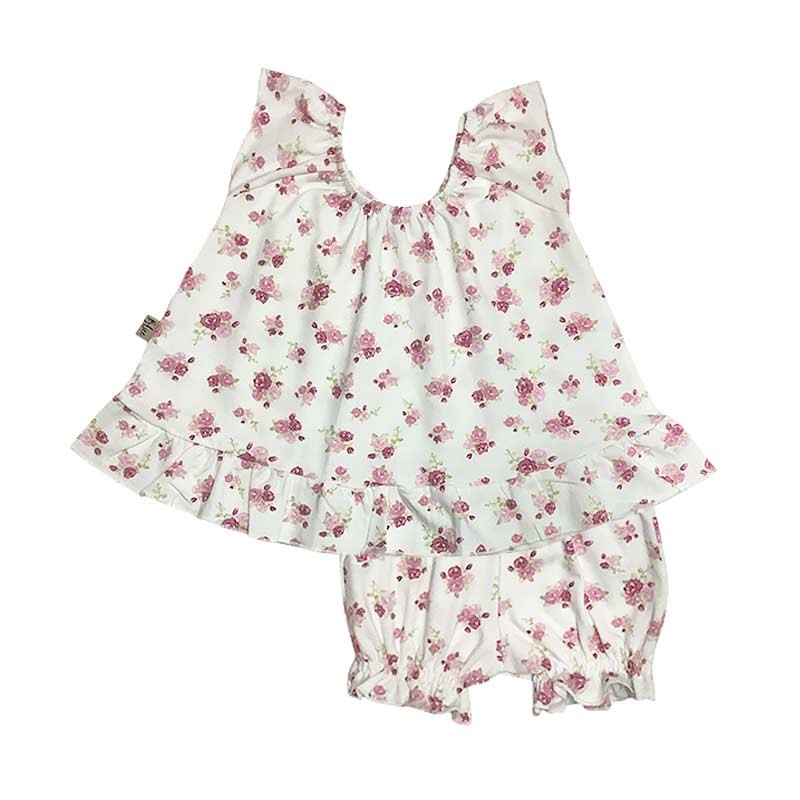 Set mini beba algodón c/lycra: vestido estampado con volados + bombachón estampado.